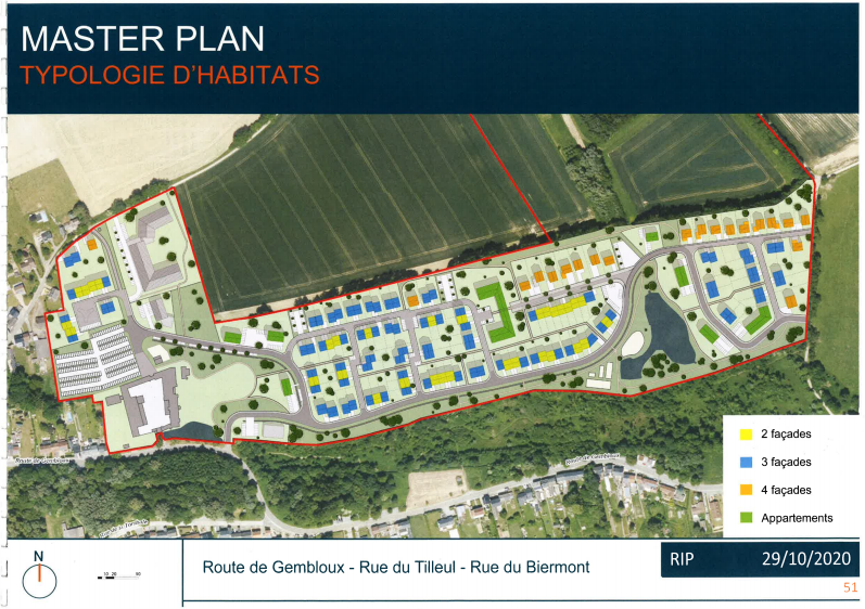En effet, il s’agit d’une zone verte actuellement où l’on compte créer un immense quartier (l’équivalent de presqu’un demi village) avec de nouvelles voiries internes au périmètre. Ce quartier sera totalement séparé du village, seuls 2 accès sont prévus : via la route de Gembloux et la rue du Biermont. Ce qui est donc tout à fait contraire à l’urbanisation actuelle du village.